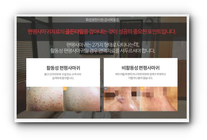 사마귀의 원인은 인간 유두종 바이러스 감염에 의한 질병으로 표피 표면에 얇고 평평한 층으로 나타납니다. 이때 병변의 색이 붉을 때는 작은 자극에도 쉽게 주변으로 확산될 수 있으므로 활성기에서 바이러스를 제거하는 것은 좋지 않으며, 이를 통해 비활성기로 유도하는 것이 중요하다. 이후에 추방합니다. 일반적으로 흔히 생각하는 사마귀의 종류는 정상 조직에서 거칠게 튀어나온 병변이다. 다양한 형태로 발생하기 때문에 모든 사람의 질환 상황에 맞는 내치와 외치가 필요하다고 말씀하셨습니다.