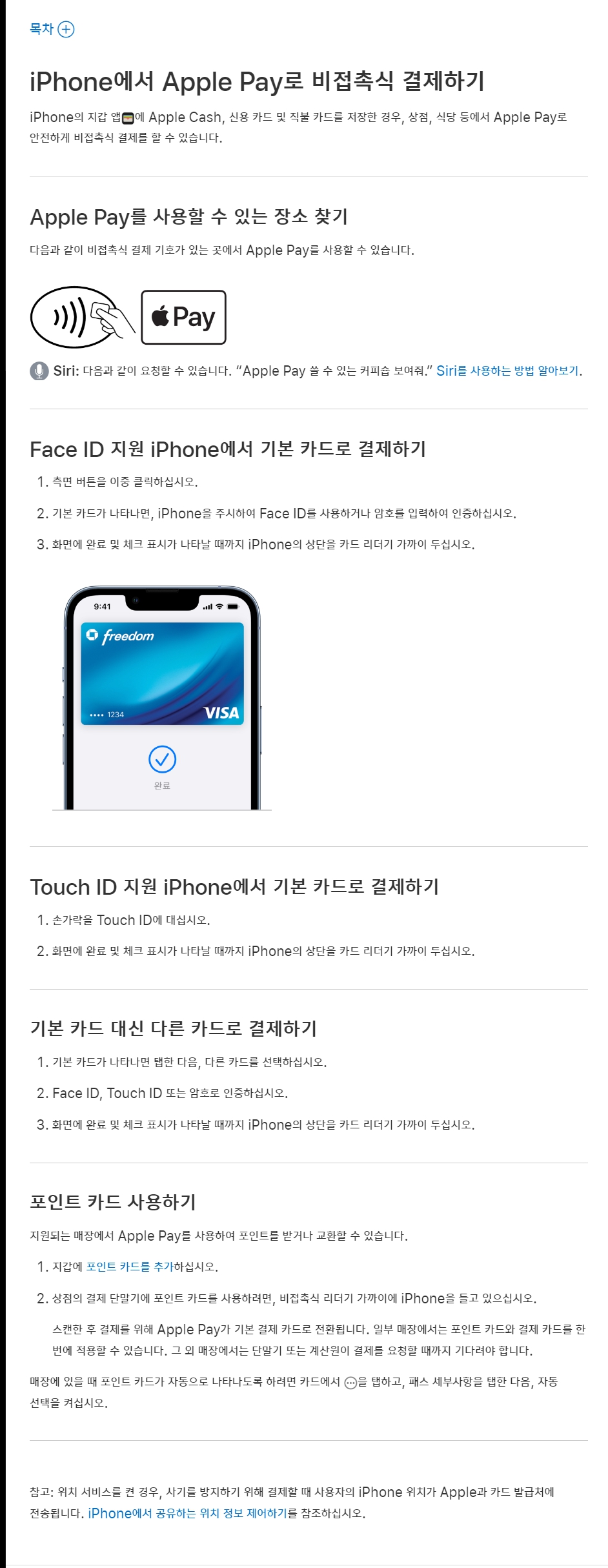 국내 대부분의 결제 단말기는 Apple Pay와 호환되지 않으며, 기능을 사용하기 위해 단말기를 교체하는 데 너무 많은 비용이 소요되어 Apple Pay를 사용하지 않았습니다.