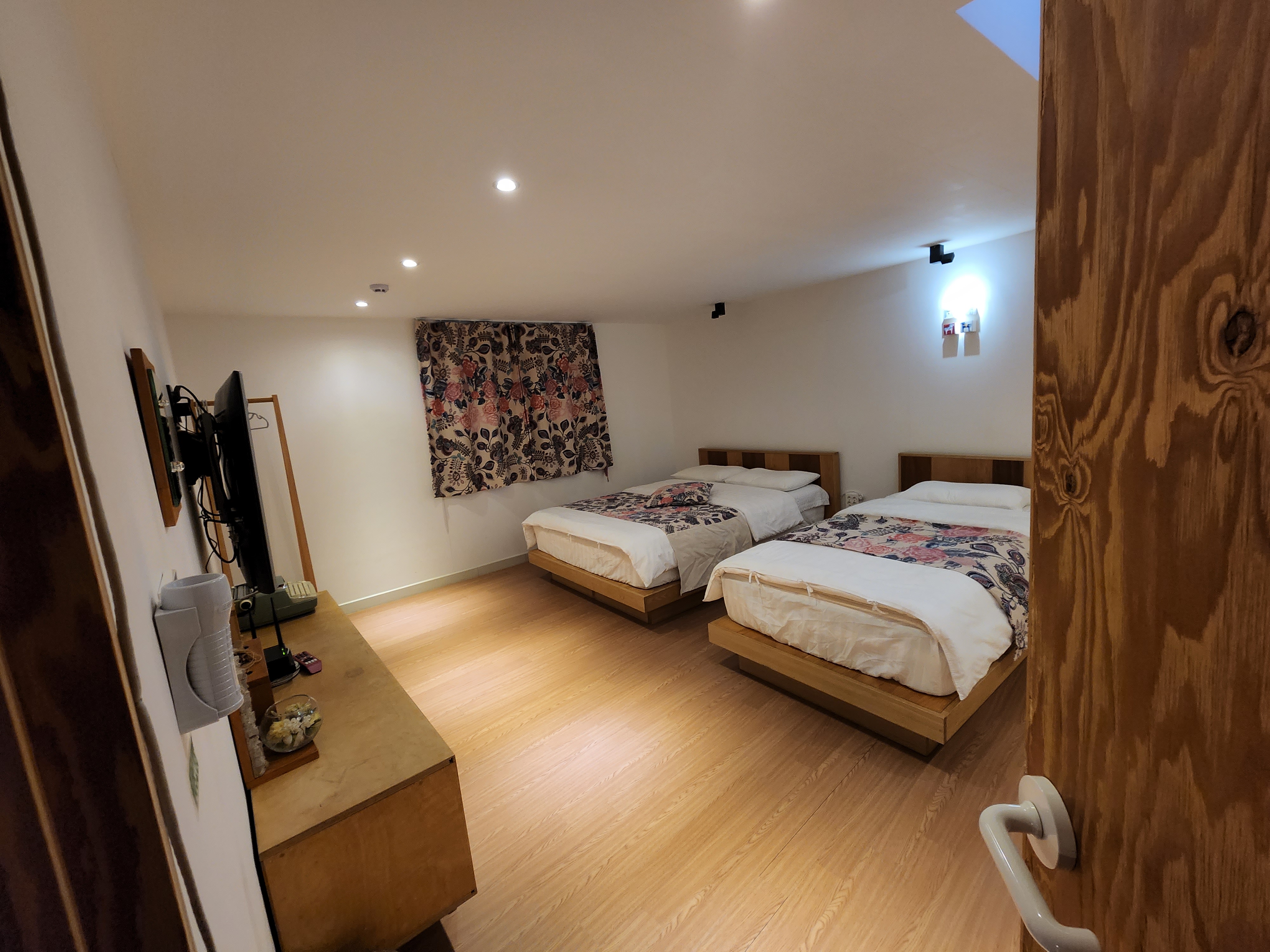 부엌을 지나면 뒤쪽에 욕실이 있는 두 개의 침대가 있는 방이 나옵니다.