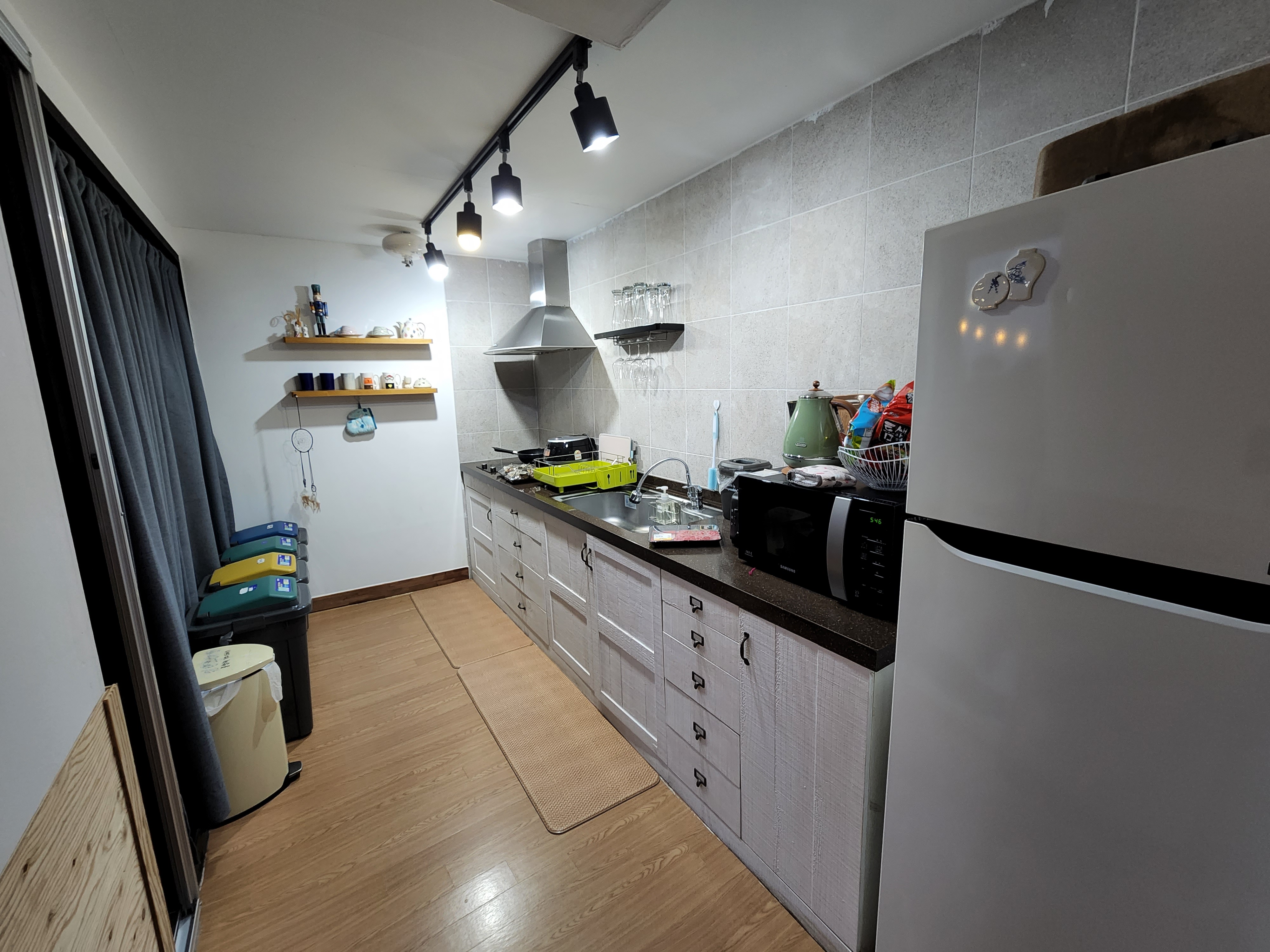 입구 왼편에 주방이 있고, 주방 오른쪽에는 마당으로 통하는 문이 있어 마당에서 편안하게 굽거나 식사를 할 수 있습니다.