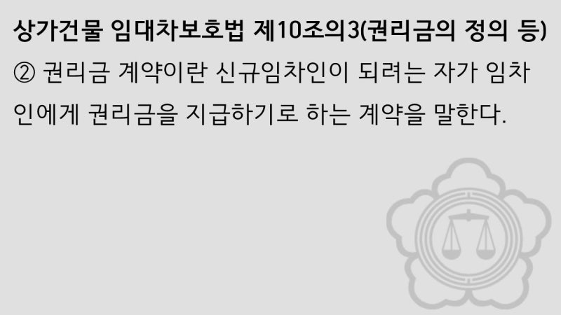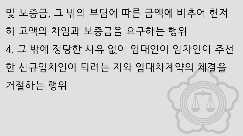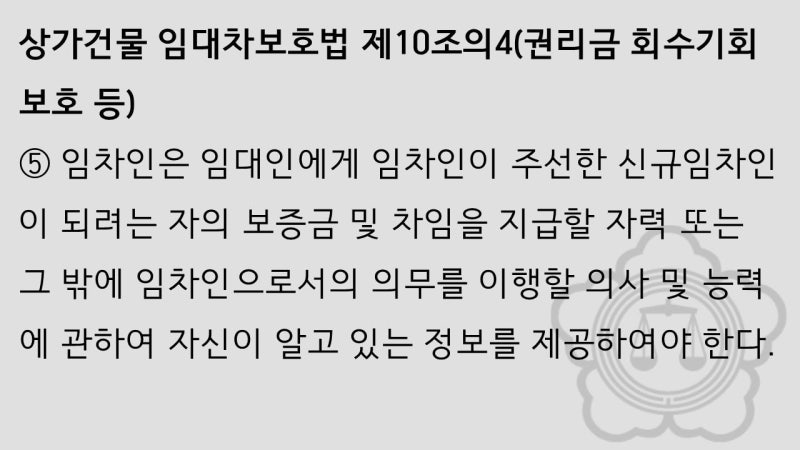 제10조의4(권리추심기회 등의 보호) ① 임대인은 임차인이 정한 권리금전계약에 의하여 다음 각 호의 어느 하나에 해당하는 행위를 함으로써 임차인이 새로 알선한 임차인으로부터 6월부터 보호한다. 임대 기간 종료. 권리의 지불은 방해되어서는 안됩니다. 다만, 제10조 제1항 각 호의 사유가 있는 자는 그러하지 아니하다. 제10조(계약갱신 요구 등) 제1항제7호 임대인은 다음과 같은 사유로 대상 건축물의 전부 또는 대부분을 철거 또는 재건축해야 하며, 대상 건축물을 다시 점유해야 합니다. 공사기간 및 소요공사기간을 정하고 계획대로 시행한다. 건물의 노후화, 파손, 부분적 유실 등 보안사고의 위험이 있는 경우를 말합니다.다른 법령에 따라 철거하거나 재건축하는 경우