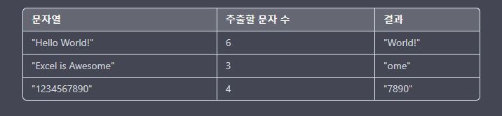 RIGHT 함수는 문자열의 우변에서 n개의 문자를 추출하는 함수로 매우 유용합니다.